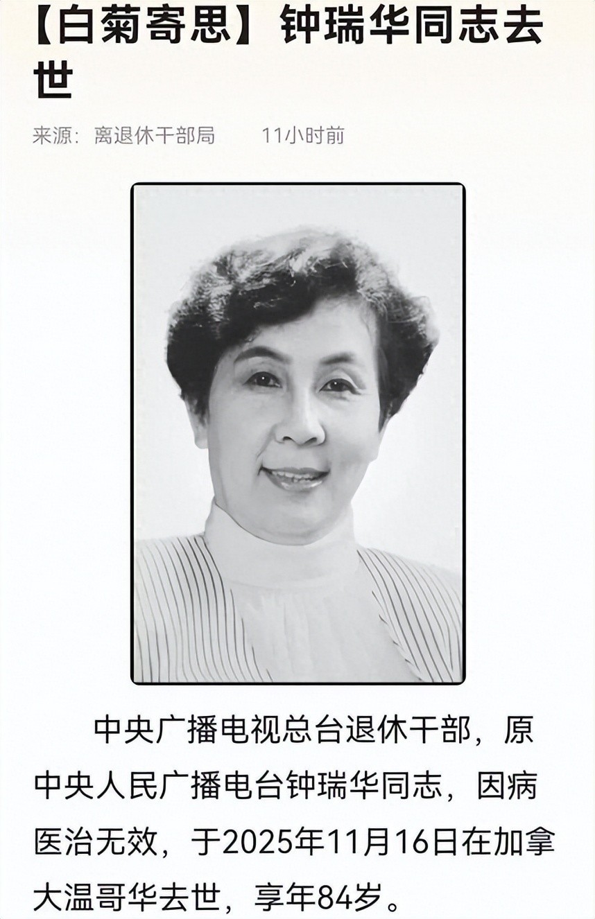 可12月16日,网上突然传出钟瑞去世的消息,她是上个月在加拿大病逝的,享年84岁。