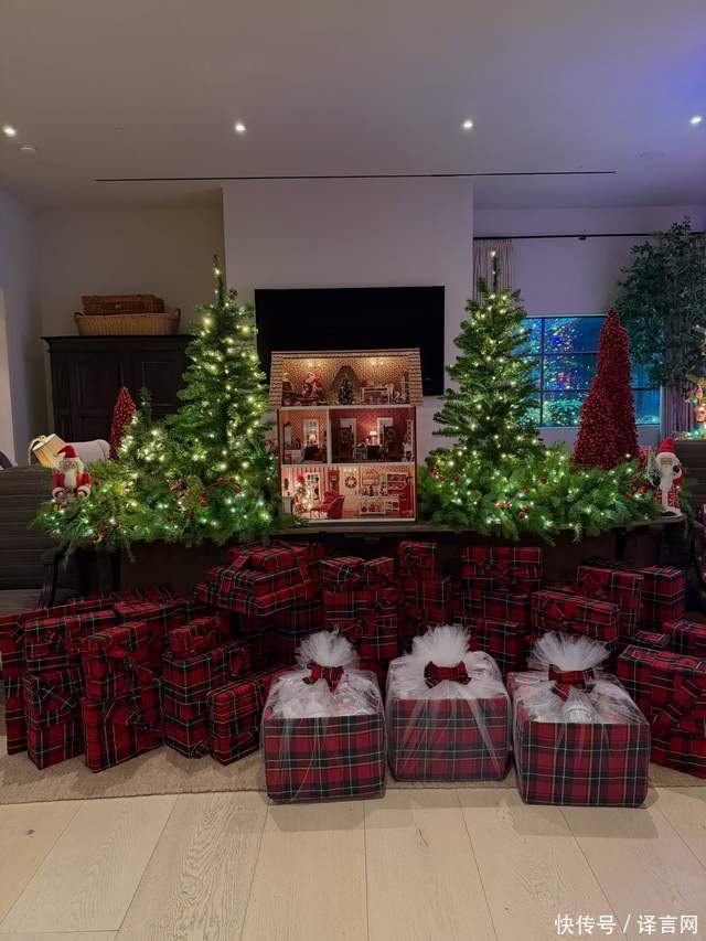 除了与男友的甜蜜互动,克里斯分享的照片更全方位展现了家族圣诞的奢华与温馨。整个豪宅被打造成梦幻圣诞世界:客厅里矗立着一片明亮的圣诞树林,厨房和餐桌被翠绿的树枝环绕,房间里堆满了用红色格子纸精心包装的礼物,数量多到几乎堆成小山。