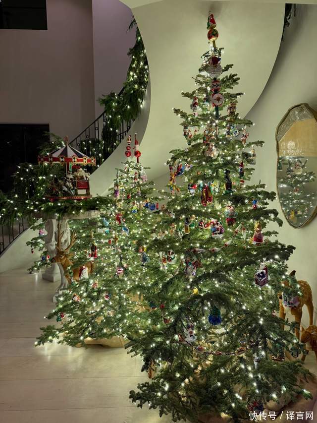 入口处的螺旋楼梯缠绕着华丽的花环,超大号的毛绒驯鹿守在圣诞树旁,精美的胡桃夹子玩偶和精致的姜饼屋散落各处,每一处细节都透着豪门的精致与用心。餐厅里,铺着红色桌布的长桌被节日中心装饰点缀得格外雅致,这场 “亲密” 的家庭聚会虽不张扬,却处处彰显着格调。